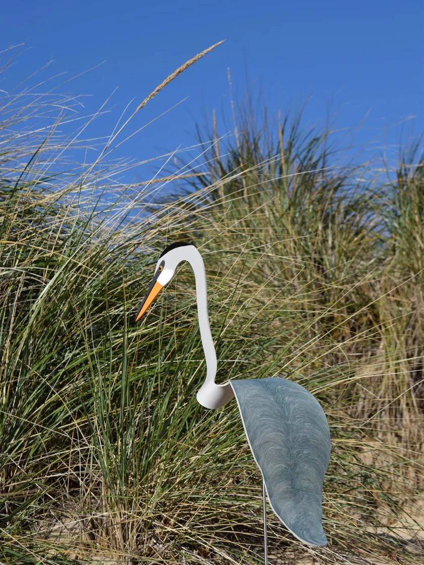 This Great Blue Heron dances on the slightest breeze. A special hinge allows it to swivel and dip atop a 35″ galvanized stake. It is 24″ long x 6.5″ wide. Made from UV-resistant PVC, entirely hand painted and hand formed, it is durable in day-to-day weather. Simply lift off the stake to take in during severe weather or extreme temperatures. Made in the USA.